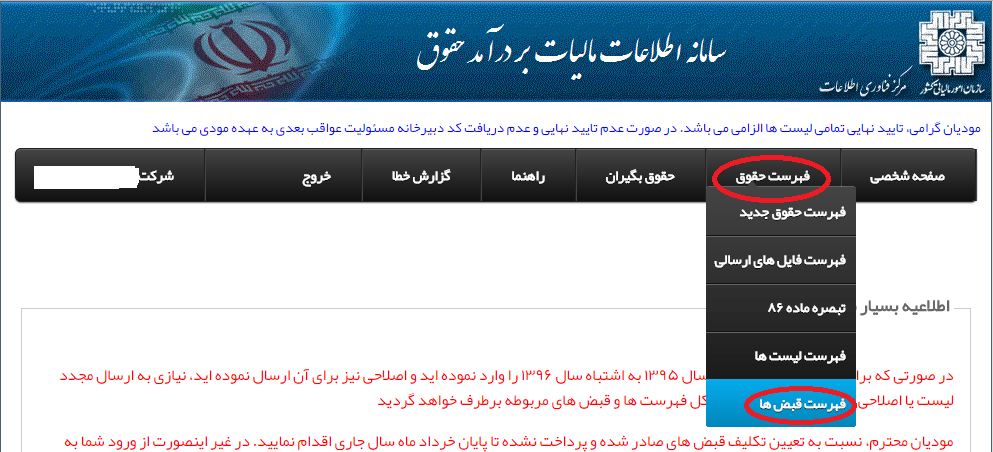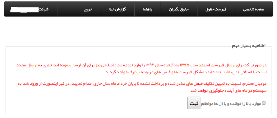 پیام اول: در صورتی که برای ارسال فهرست اسفند سال 1395 به اشتباه سال 1396 را وارد نموده اید و اصلاحی نیز برای آن ارسال نموده اید، نیازی به ارسال مجدد لیست یا اصلاحی نمی باشد. تا ماه آینده مشکل فهرست ها و قبض های مربوطه برطرف خواهد گردید.